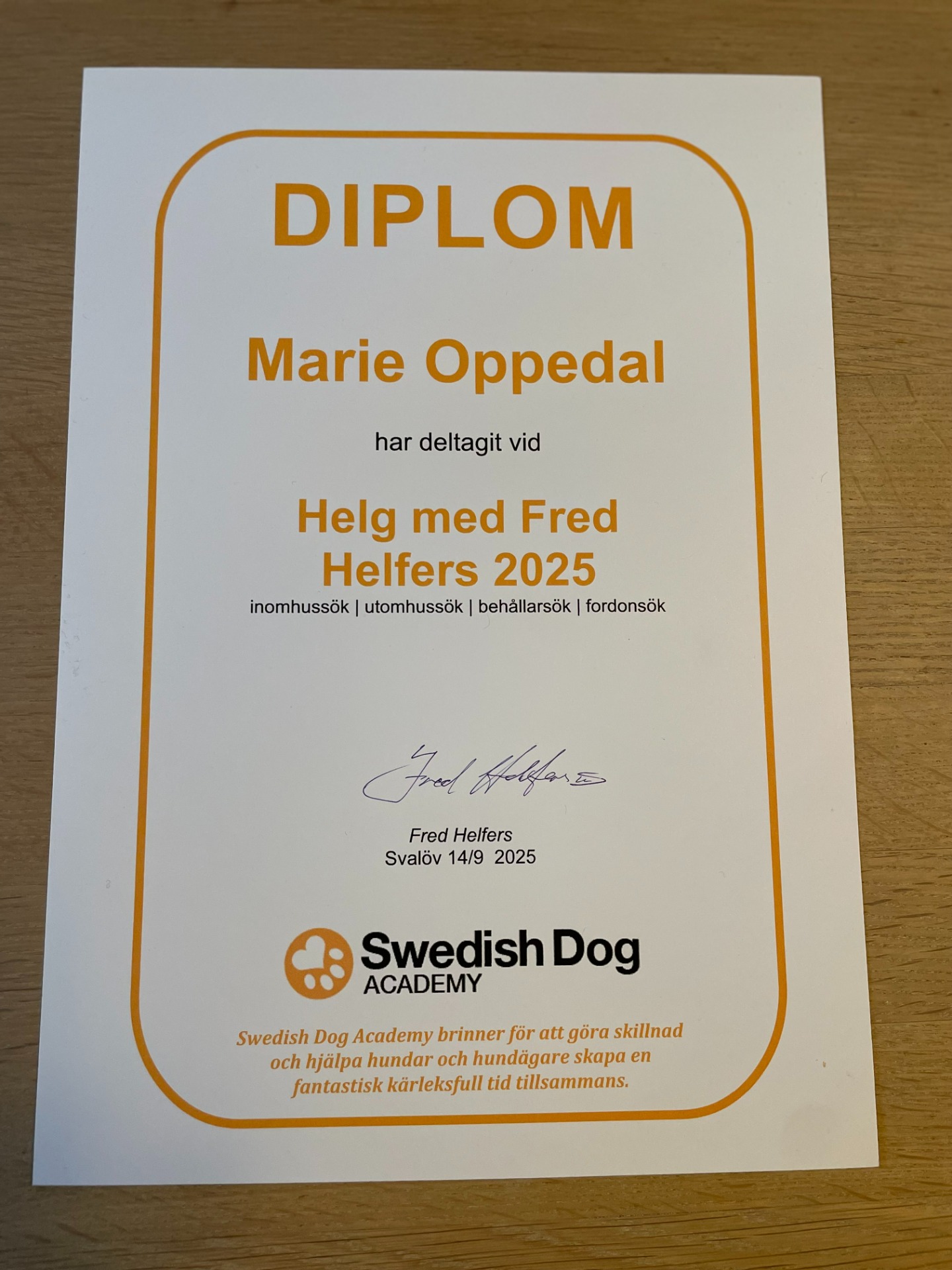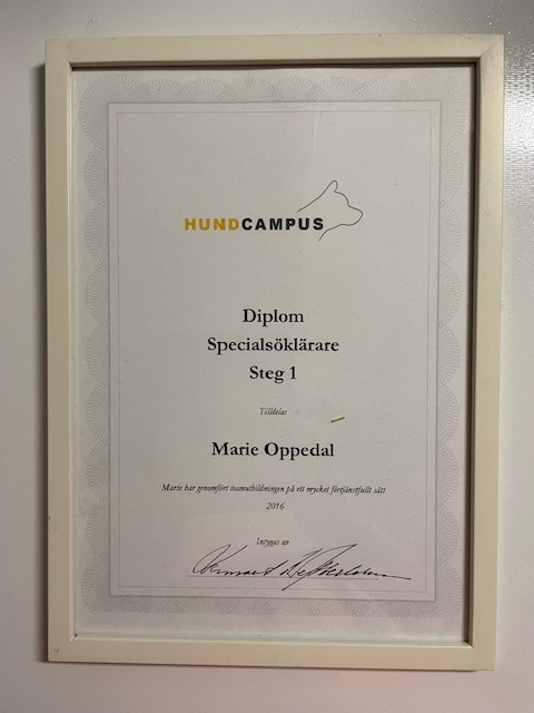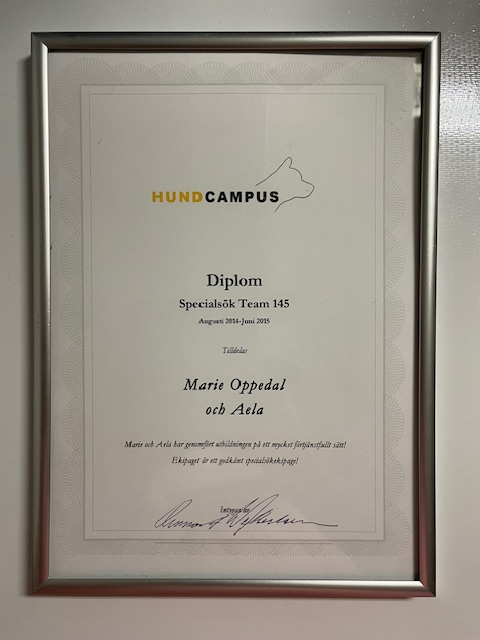 Specialsøks ekvipasje, Specialsøk Team 145, HundCampus, Sverige. 1 årig utdannelse. 2015. (Utdannet meg sammen med Pumin Aela, som jeg hadde da.)